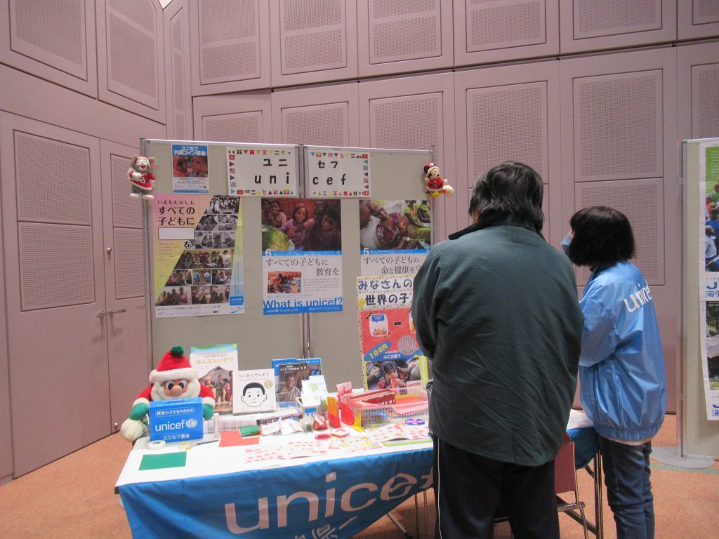 「KIAフェスティバル」は、外国人と日本人が一緒に企画する多文化共生・国際交流イベントです。各務原在住、勤務、通学している外国人たちが中心になってブースを出しています。ステージ企画もあり、建物の外では、国際色豊かなキッチンカーが並びました。ユニセフはクリスマスの折り紙をメインにやりました。絵本ももっていきました。椅子に腰かけて読む子もいました。